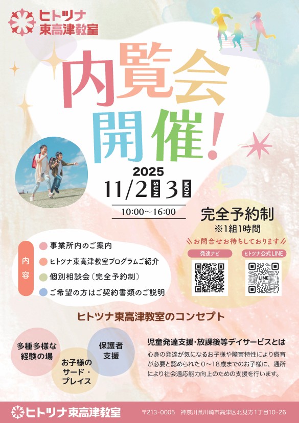 この度、令和7年11月以降に開業予定の「児童発達支援・放課後等デイサービス ヒトツナ東高津教室」にて、内覧会を開催いたします。
